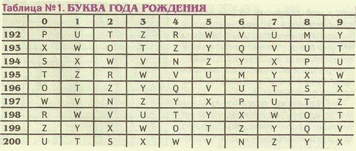 В вертикальной колонке Таблицы 1 найдите первые 3 цифры года Вашего рождения, в горизонтальной последнюю. На пересечении линий — буква года!